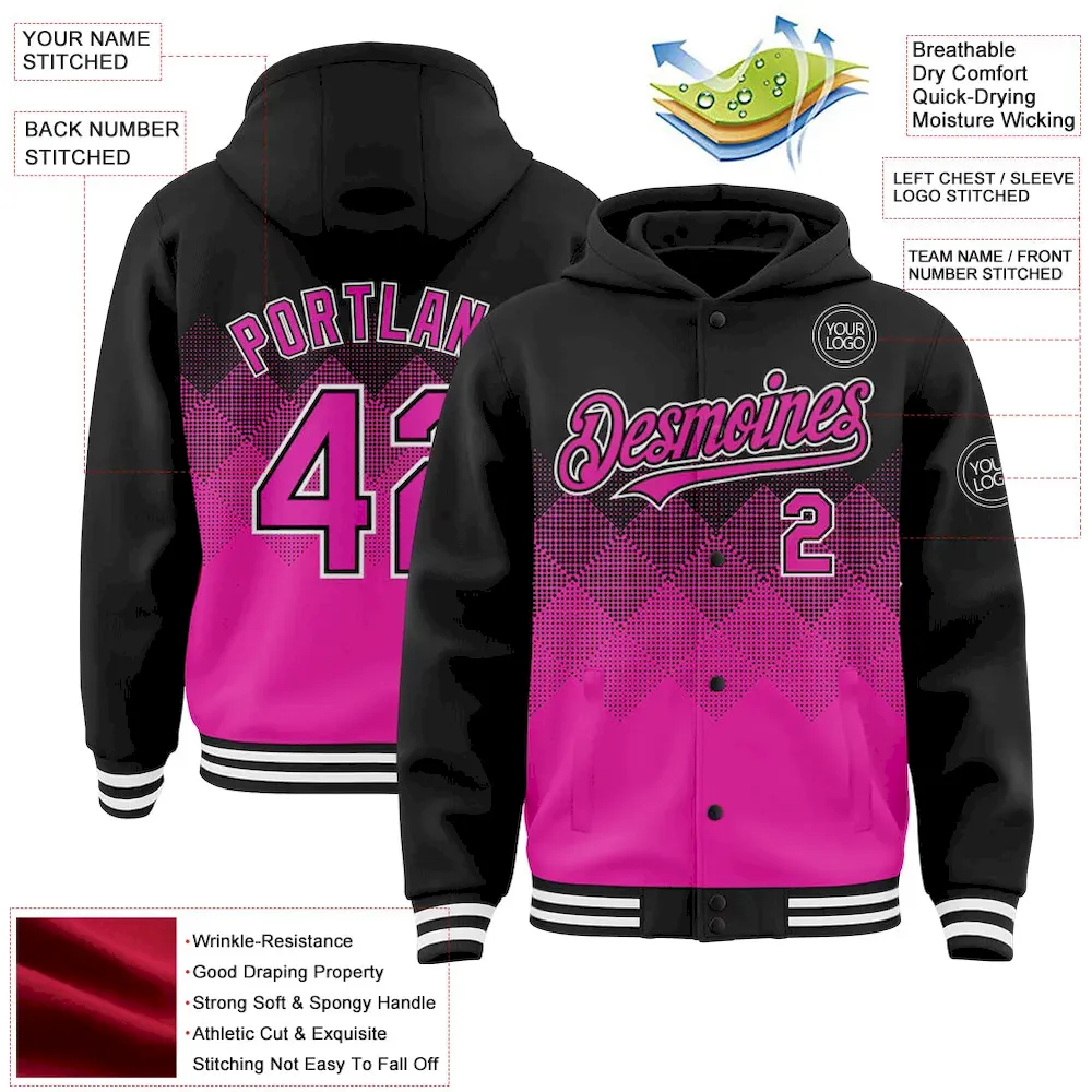 Custom Black Deep Pink-White Gradient Square Shape 3D Pattern Design Bomber Full-Snap Varsity Letterman Hoodie Jacket