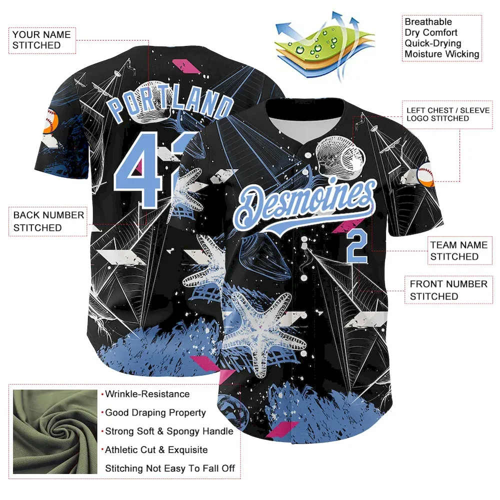 Custom Black Light Blue-White 3D Pattern Design Sailing Boats Authentic Baseball Jersey