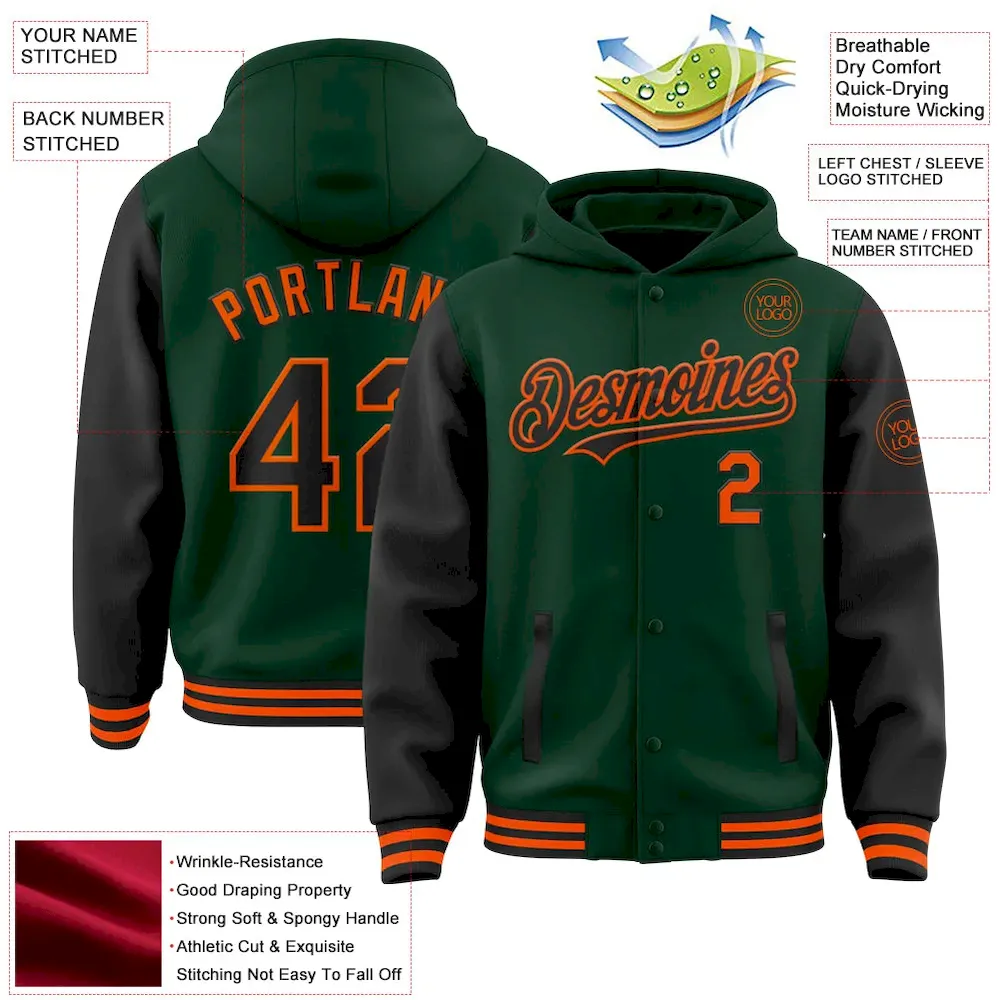 Custom Green Black-Orange Bomber Full-Snap Varsity Letterman Two Tone Hoodie Jacket