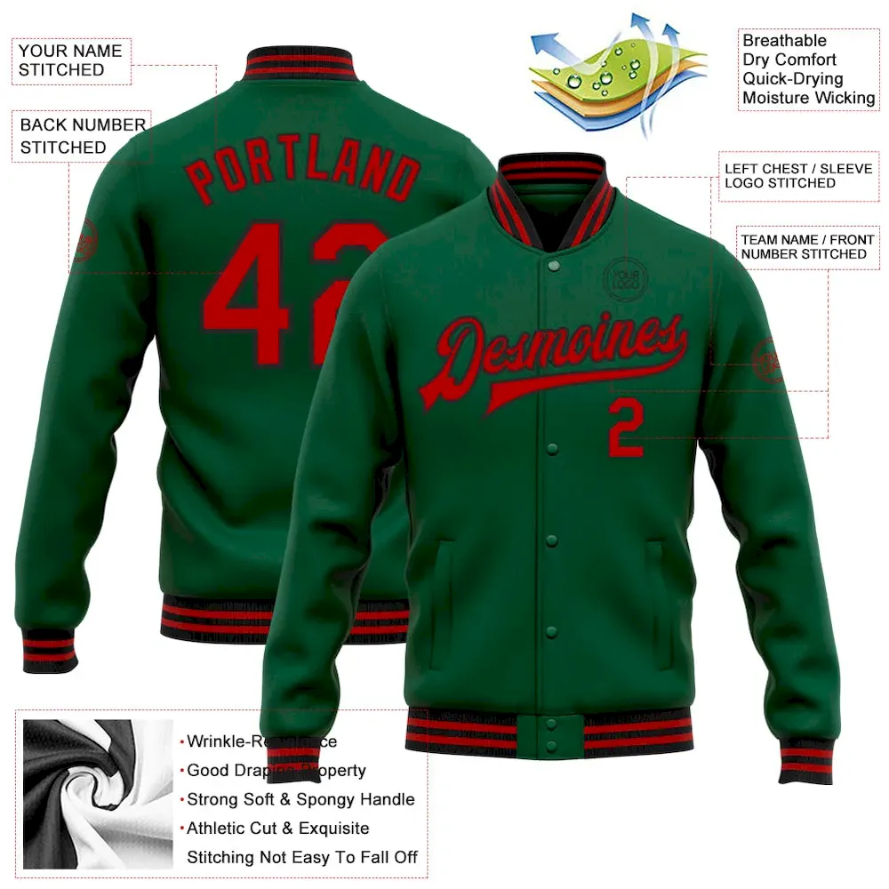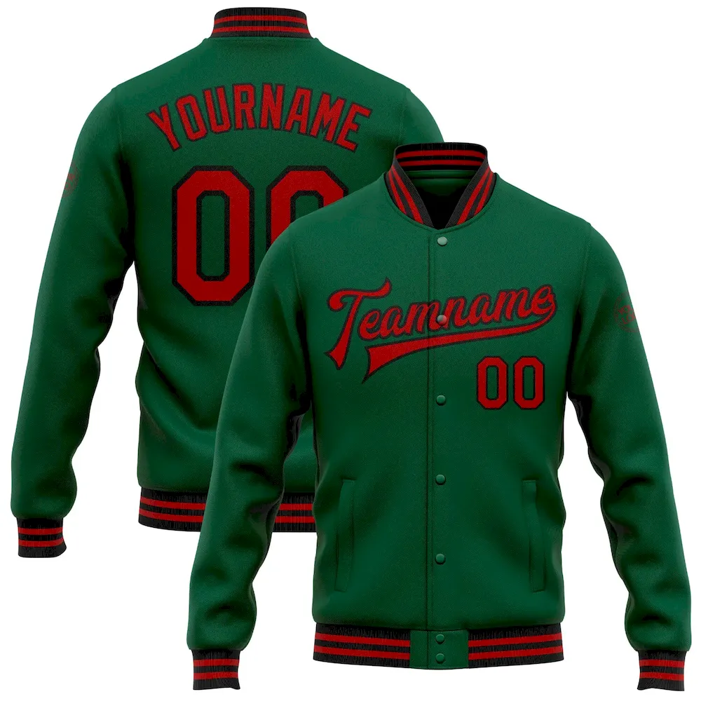 Custom Kelly Green Red-Black Bomber Full-Snap Varsity Letterman Jacket
