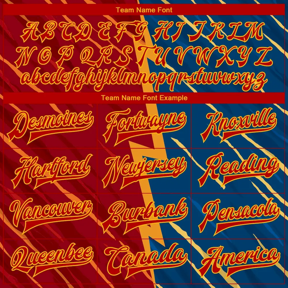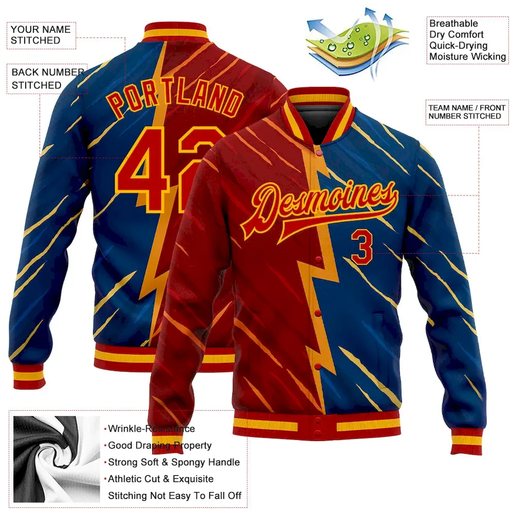 Custom Navy Red-Gold 3D Pattern Design Bomber Full-Snap Varsity Letterman Jacket